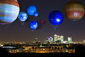 The show above the Royal Greenwich Observatory was organised to promote the launch this month of Sky 3D – Europe’s first 3D TV channel. Nine helium-filled “planets” up to 20ft wide were illuminated and floated above the landmark. It recreates scenes from the 3D premiere of The Universe: 7 Wonders Of The Solar System, from History, which will screen on Sky 3D on October 24th.