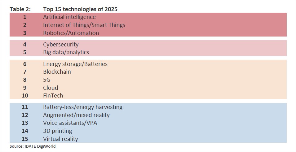 According to him, they are seen as the most important ones for the future (but not necessarily the most valuable), and the ones that really stand out from other digital technologies. The top 15 technologies for 2025 are identified below: