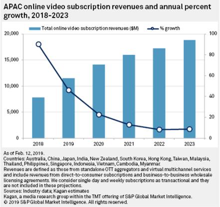 According to an analysis by S&P Global Market Intelligence, total Asia-Pacific subscription online video revenues and subscribers continue to grow, primarily reflecting the success of the Chinese market. However, the analysis anticipates growth in all Asia-Pacific countries covered as digital infrastructures improve, local services increase the value of content behind the paywall and international services increase localisation.