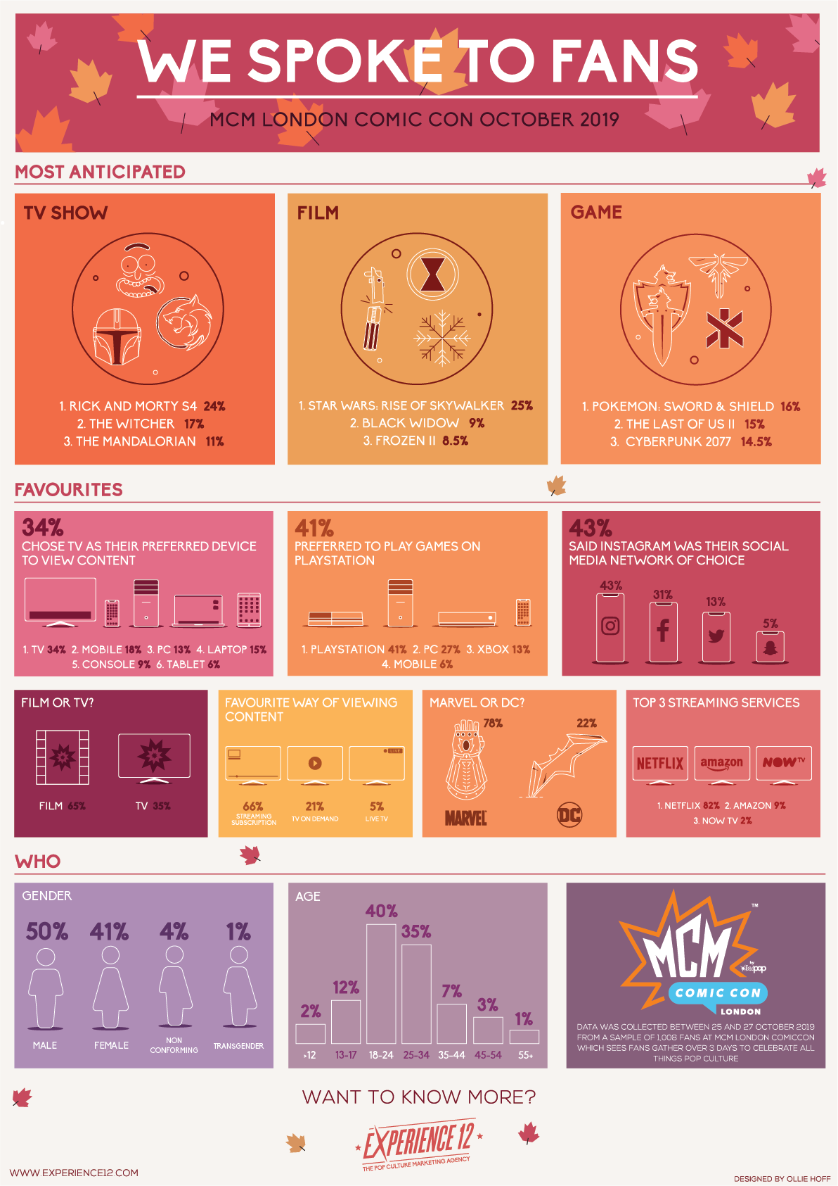 Experience12 polled 1,008 fans at the MCM London Comic Con, that took place at the ExCeL from October 25th – 27th, exploring consumer habits related to the most anticipated and favourite game, film and TV releases, alongside preferred ways to consume content.