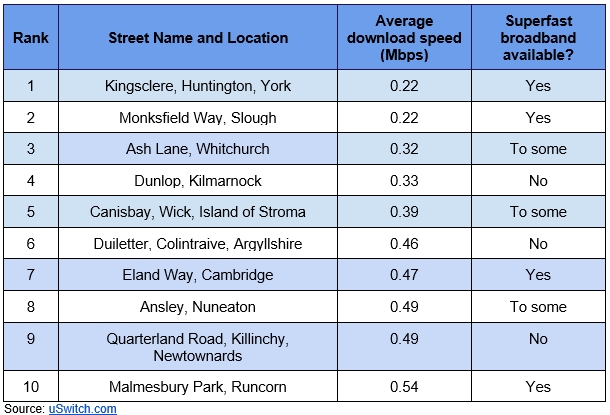 The slowest broadband in the UK, with an average download speed of 0.22Mbps, is found in Kingsclere, Huntington in York, according to the latest consumer speed tests collated by uSwitch.com, the price comparison and switching service.