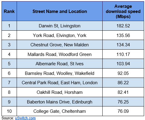 “It’s ridiculous to think that it would take someone in York Road, Elvington less than seven minutes to download a two-hour HD film like Toy Story 4, yet it would take more than two and a half days for someone living less than 16 minutes’ drive away in Kingsclere, Huntington. Lack of awareness regarding superfast broadband is one of the biggest obstacles stopping people from getting faster download speeds. More than two-thirds of the slowest streets have access to superfast broadband, so we urge residents there — and anyone else unhappy with their broadband speeds — to visit uSwitch.com to see what speeds they could be getting,” concluded Warner.