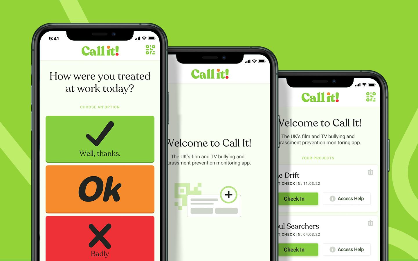 Designed to engender collective and individual accountability, Call It! seeks to empower everyone working in the film and TV industry to record incidents quickly and anonymously, providing easy access to companies ‘Dignity at Work’ Policies and procedures for formal reporting, and signposting confidential mental health support. The App enables companies and productions to monitor the safety and wellbeing of their staff by asking, How were you treated at work today?and gathering anonymised data regarding experiences of bullying and harassment.