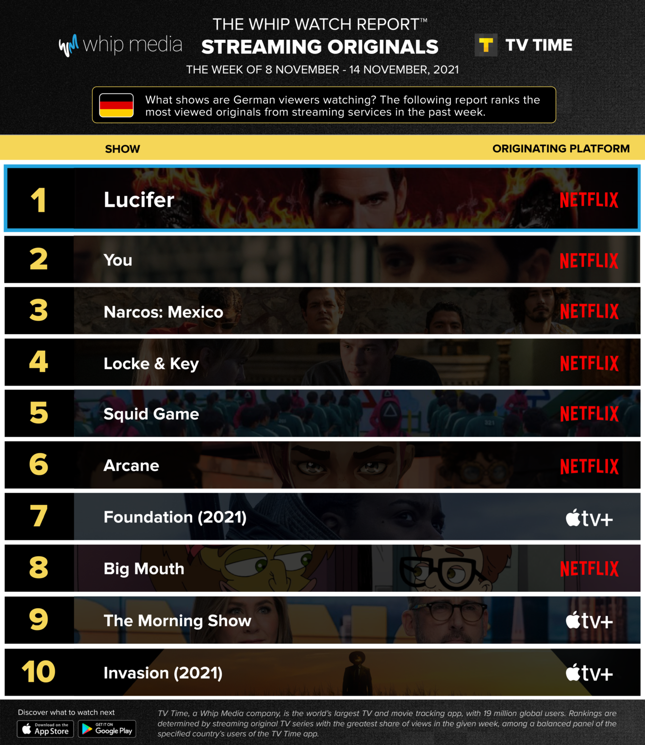 Netflix’s Lucifer leads the Whip Watch Report of streaming originals among German viewers for the week of November 8th – 14th. The Whip Watch Report ranks the most viewed series originating from SVoD platforms in the past week.