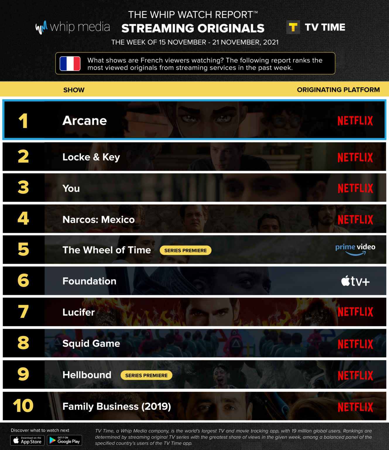 Netflix’s Arcane leads the Whip Watch Report of streaming originals among French viewers for the week of November 15-21. The Whip Watch Report ranks the most viewed series originating from SVoD platforms in the past week.