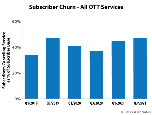 Parks Associates finds that all methods where subscribers interact with OTT services, from subscription to platform usage, are rapidly diversifying. In the early market, households would subscribe directly via an OTT provider’s website, but the percentage of households subscribing directly via an OTT provider’s website declined from 41 per cent to 29 per cent between Q1 2020 and Q3 2021. Instead, households are taking multiple paths to video subscription, including through OTT aggregators.