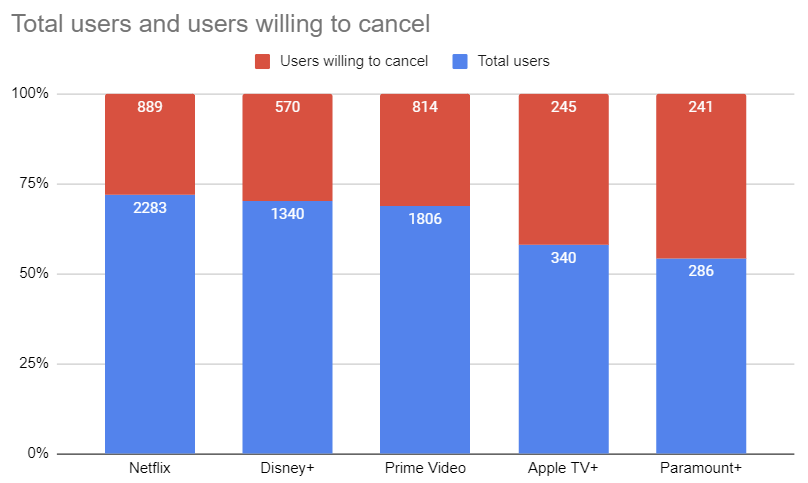 Paramount+ and Apple TV+ have notably higher cancellation rates of 84 per cent and 72 per cent, respectively, suggesting that they may need to focus on user retention strategies and content offerings to reduce churn.