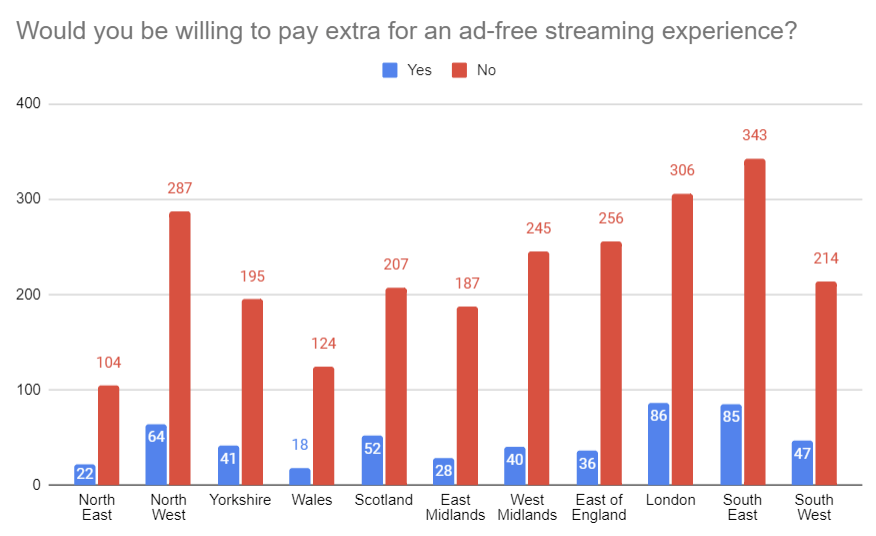The survey also found that 82.69 per cent of users, regardless of age, are not willing to cough up extra cash for an ad-free experience. But, and here’s the twist, when the idea of ads entering their favourite platforms is on the table, the willingness to cancel shoots up. In Greater London, for instance, 78.06 per cent are saying no.