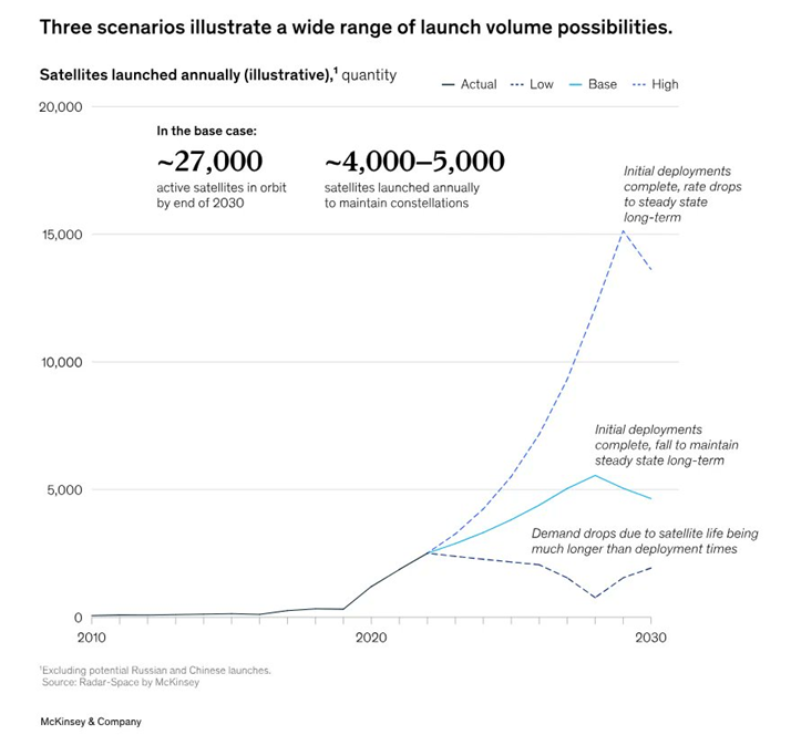 The McKinsey study looked at three potential scenarios. The first considered that demand drops due to satellites in orbit lives being much longer than deployment times. This scenario forecasts that the replacement cycle could fall to between 1,000-2,500 satellites annually.