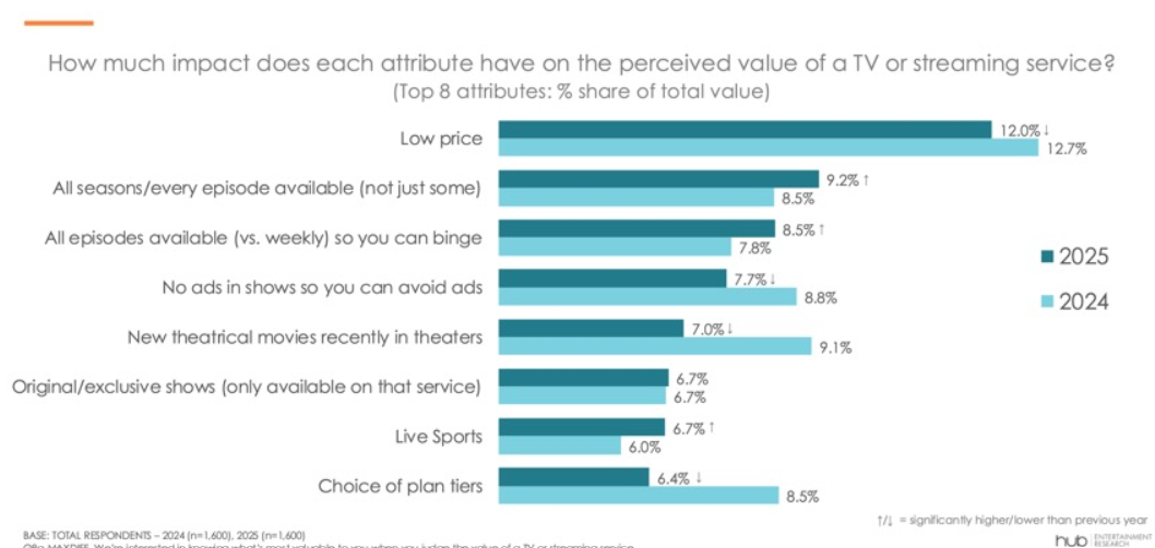 To better understand viewer priorities and how they value different aspects of TV services, Hub asked respondents to rank what they value most when choosing a TV service. Of 16 attributes tested, below are the top attributes and the percentage share they contribute to the total value of a service – with some notable changes since last year: