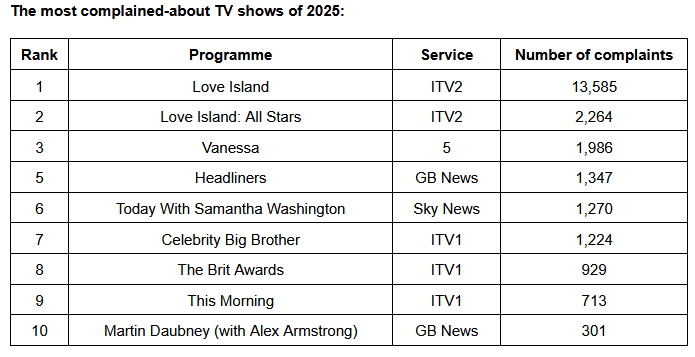 The top 10 most complained-about TV shows of 2025 so far have been revealed – with ITV’s Love Island topping the list, and fellow ITV show This Morning entering the top 10 following a migrant rant from one of its presenters.