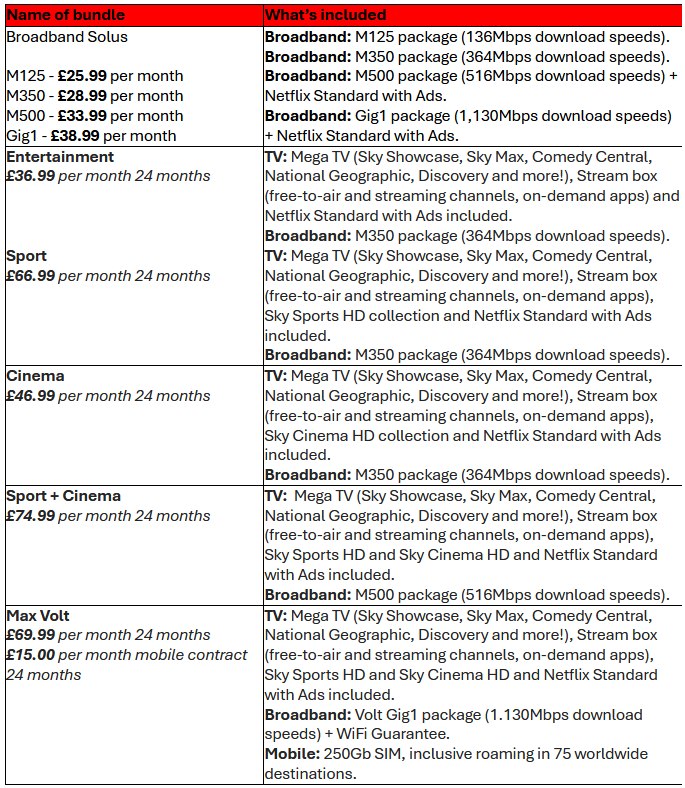 New and re-contracting customers can choose from five core TV packages which have been refreshed and renamed. From HD as standard on Sky premium channels to M250 broadband becoming the introductory broadband speed for all TV bundles, the new offering aims to provide a more personalised and simple experience for customers, as well as a smoother, more intuitive online sales experience.