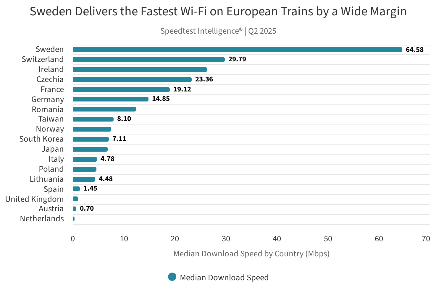 - The gap separating Europe’s best and worst is startling. In Q2 2025, Sweden set the pace for train Wi-Fi in Europe with a 64.58 Mbps median download, followed by Switzerland (29.79 Mbps) and Ireland (26.33 Mbps). Laggards like Spain (1.45 Mbps), the UK (1.09 Mbps) and the Netherlands (0.41 Mbps) featured the poorest outcomes, with download speeds as much as 158 times slower than top-performing Sweden.