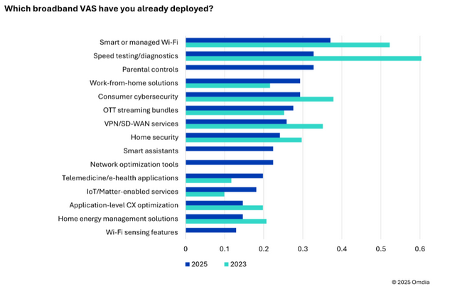 Work-from-home solutions has emerged as the fastest growing broadband value added service (VAS) since the previous 2023 report, with nearly 30 per cent of BSPs already deploying it. Other widely adopted services include smart or managed Wi-Fi, speed testing/diagnostics, and consumer cybersecurity. Newly surveyed VAS, parental controls, has also been widely deployed by BSPs.