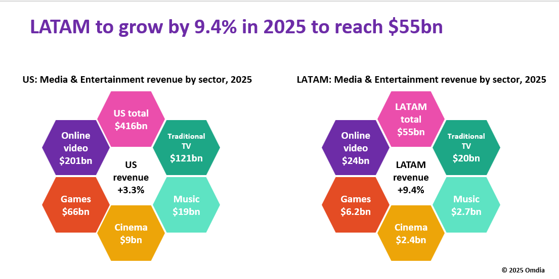 Maria Rua Aguete, Head of Media and Entertainment at Omdia, revealed during a MIP Cancun preview panel that Latin America’s media revenues will grow 9.4 per cent in 2025 — three times the 3.3 per cent growth expected in the US. This surge spans online video, television, gaming, music and cinema sectors.