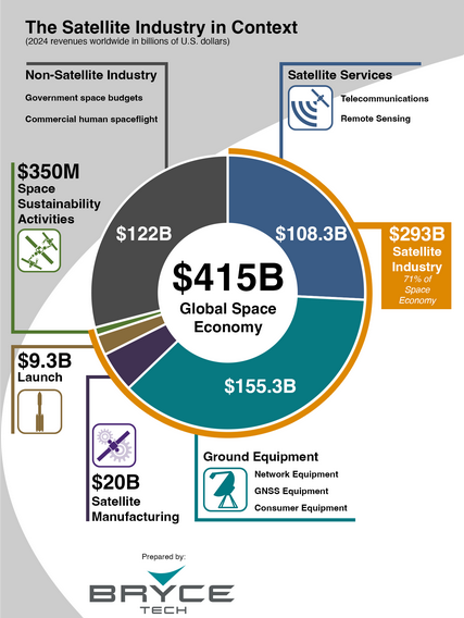 Analysts at BryceTech have examined 2024 data on behalf of the Satellite Industry Association (SIA) to provide a snapshot of the satellite sector’s role in the global space economy. In 2024, the satellite industry accounted for $293 billion, or 71 per cent of the $415 billion global space economy.