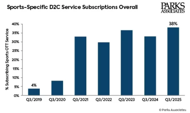 Parks Associates has punblished research revealing that 38 per cent of US internet households subscribe to at least one sports-specific streaming service, up from just 4 per cent in 2019.