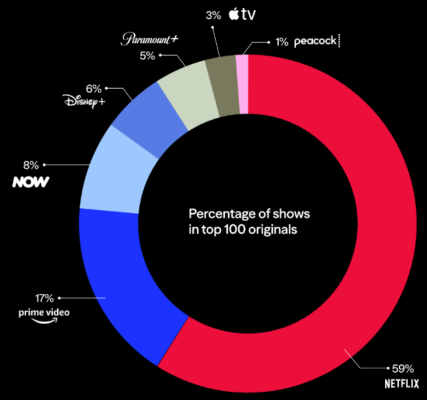 Netflix dominates streaming originals, producing 59 per cent of the top 100 shows, followed by Prime Video at 17 per cent and NOW at 8 per cent. Two distinct competitive strategies emerge: Netflix wins through volume and content diversity that serves varied audience segments, while platforms like NOW and Apple TV compete through selective, quality programming that builds premium and loyal, niche audiences. The platforms under the most competitive pressure often fall in the middle, producing less content than Netflix while not benefiting from the premium positioning of quality-focused competitors.