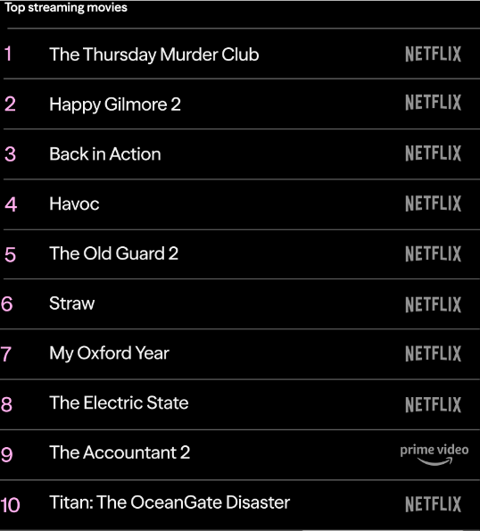 Netflix claims nine of the 10 top streaming movie positions in 2025 (to date), including the likes of The Thursday Murder Club and Happy Gilmore 2. Prime Video’s The Accountant 2 represents the sole non-Netflix entry. This concentration demonstrates Netflix’s comprehensive movie strategy success of combining original productions with licensed content to create consistent movie availability. The Thursday Murder Club‘s top position suggests UK audiences respond highly to relevant local content that reflects British culture, even within Netflix’s global catalogue.