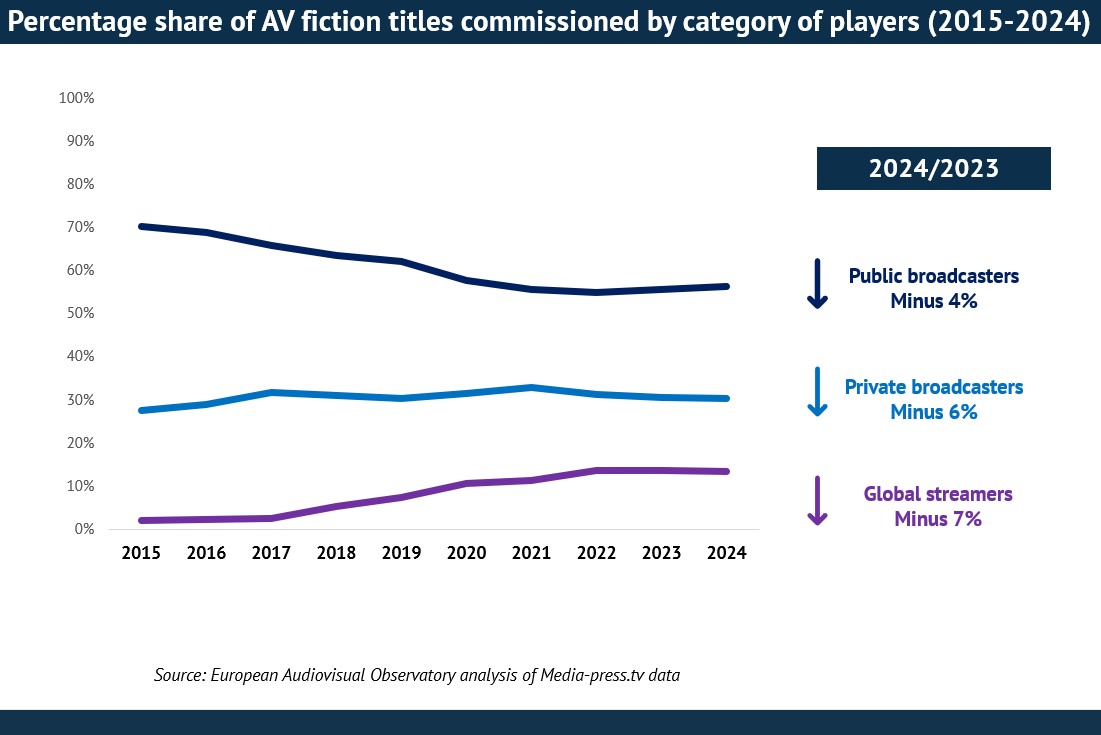 • In 2024, public service broadcasters commissioned over half of all fiction titles produced in Europe (56 per cent), followed by private broadcasters (30 per cent) and global streamers (14 per cent).