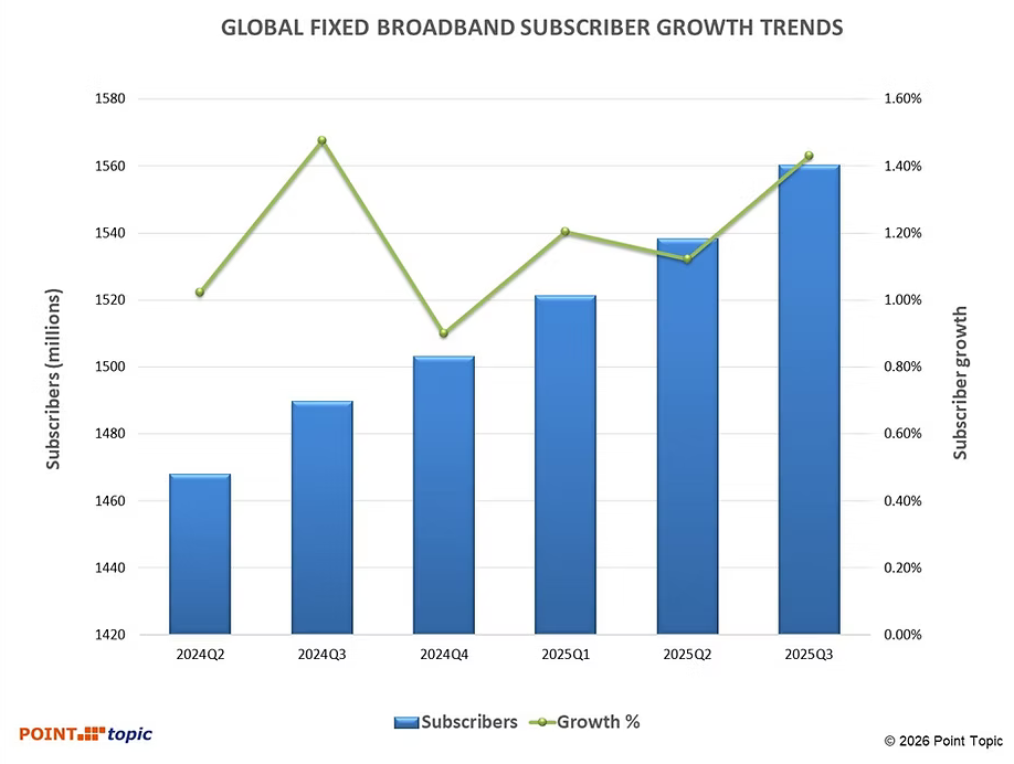 Global broadband subscribers surpassed 1.56 billion in Q3 2025, marking a 1.46 growth, only slightly lower than in Q3 2024, according to the Q3 2025 Broadband Subscriber Trends from Point Topic.