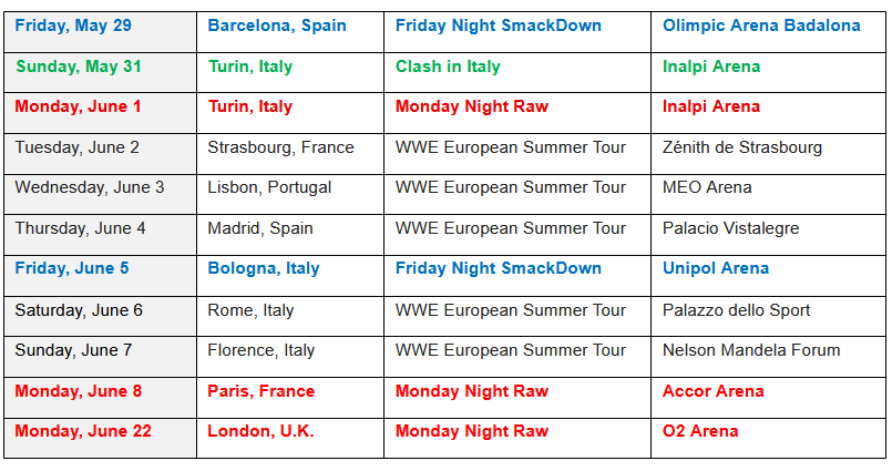 Additionally, Monday Night Raw will also take place at Turin’s Inalpi Arena on June 1st, before broadcasting live from Paris’ Accor Arena the following week on June 8th and London’s O2 Arena on June 22nd.
