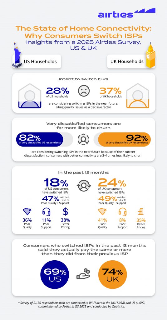 In advance of the 2025 Network X conference, Airties, a specialist in AI-driven software that improves the connectivity experience, has announced findings from a consumer survey, independently conducted by Qualtrics, of more than 2,000 households across the US and UK. The survey revealed a looming churn crisis for ISPs: approximately one-third of households are considering […]